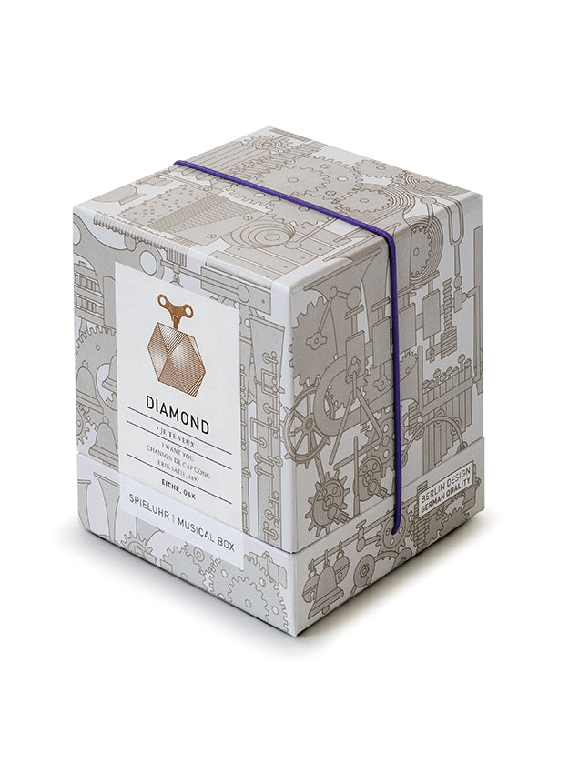 It is through faceting that a rough diamond achieves its unique appeal. The sophisticated geometrical form of our new musical box DIAMOND refers back to this craft and its long tradition, turning it into a unique contemporary sculpture. The 18-note mechanical musical movement plays the soulful melody ‘Je te veux, I want you’ – a chanson by the french composer Erik Satie. DIAMOND is ‘a girl's best friend’ and a lasting gift for special occasions.