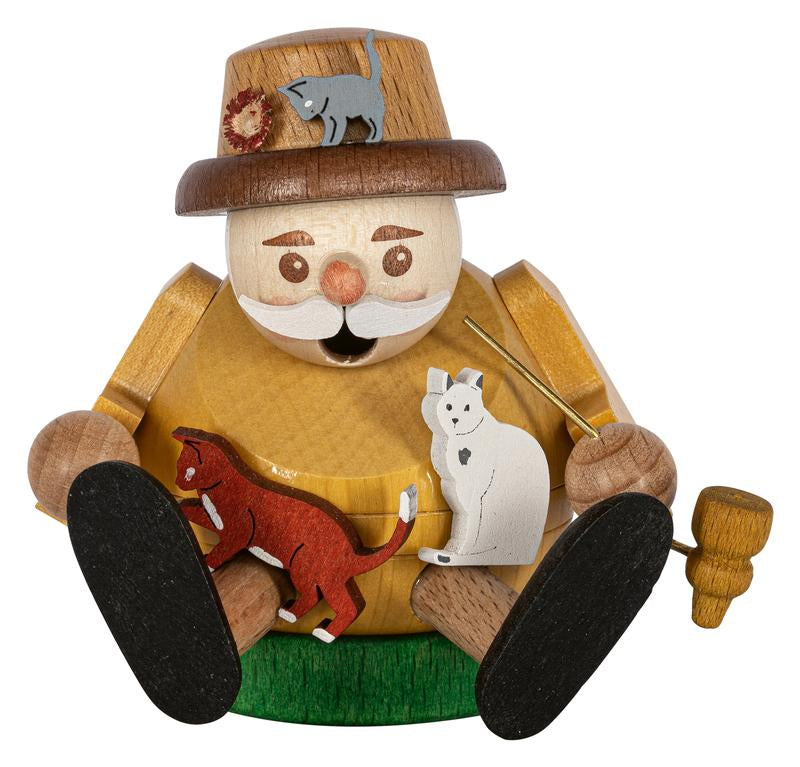 Manufactured by Richard Glässer in the famous Seiffen region of Germany, this cute little "räuchermann" (Smoking Man) is in the figure of a sitting man with his cats.